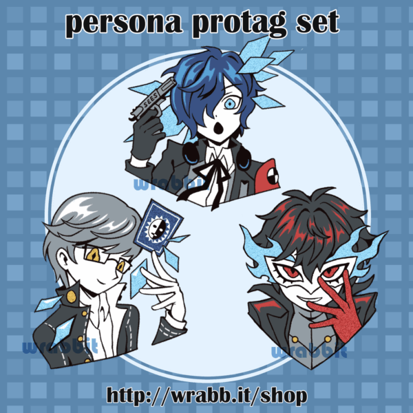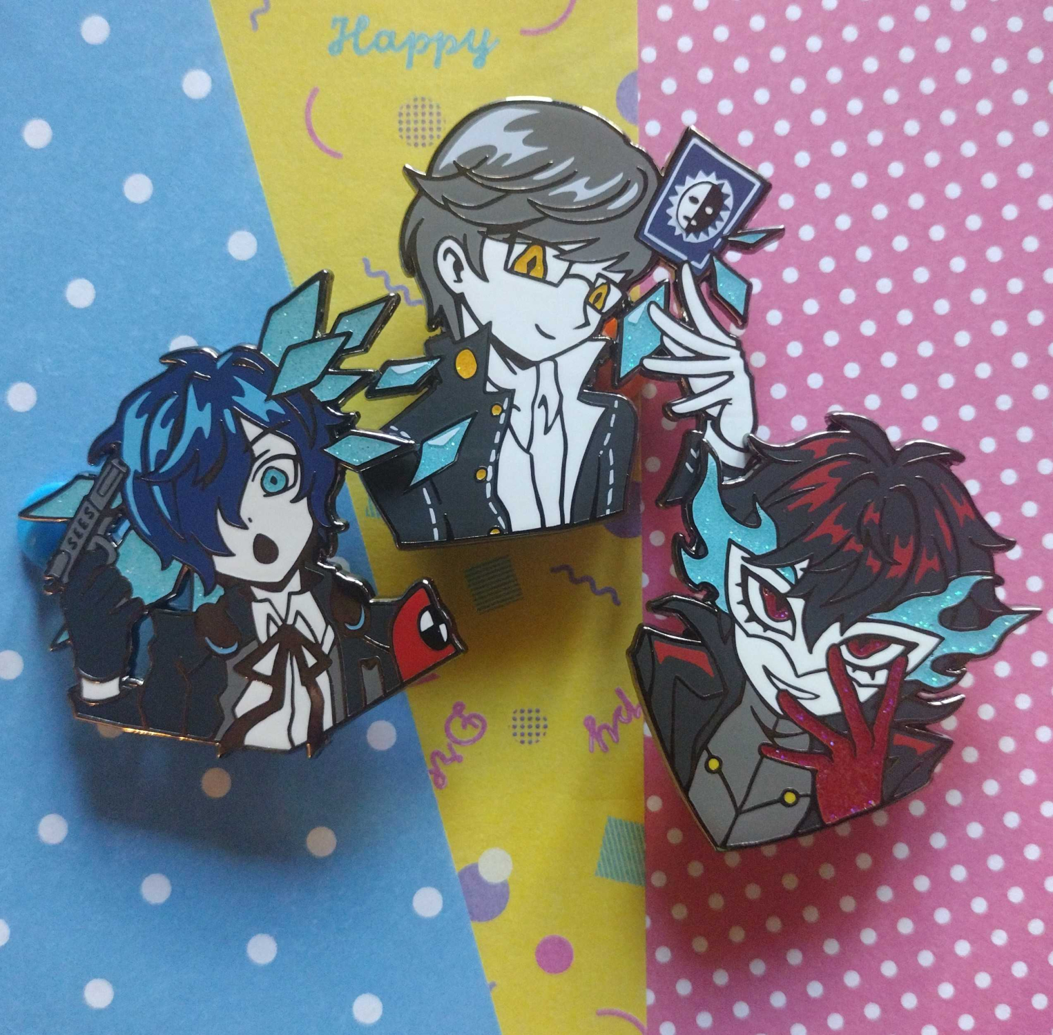 An enamel pin collection featuring the protagonists of the Persona series. These games mean a lot to me, and I remember meeting many other artists through our mutual love of the games.